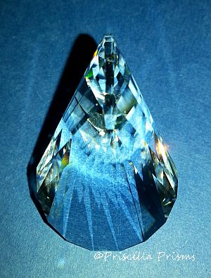 Such an unusual Aurora glow that it looks battery operated! A smooth, slender, tapered drop Tiny itty rainbows shoot from the delicate faceting. While this crystal design is not new, What a beauty! Please note: The slender 'neck' of this prism does not allow for a drilled hanging-hole.